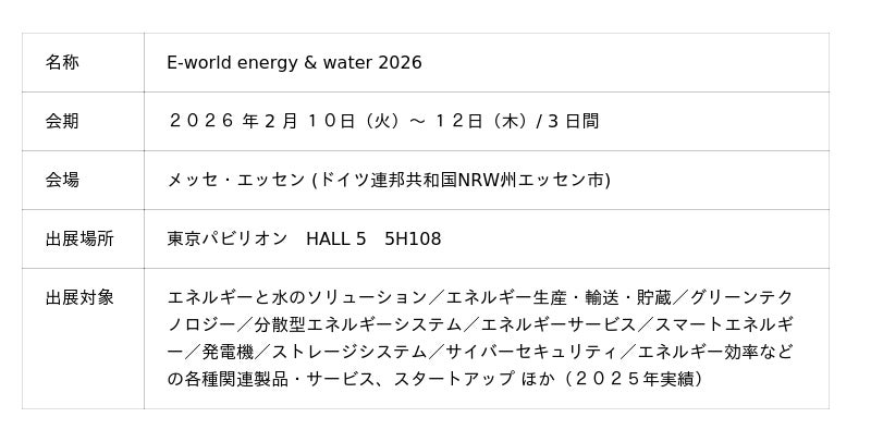 PicoCELA株式会社(東京都中央区、代表取締役:古川 浩)は、2026年2月10日(火)~12日(木)に開催される「E-world energy & water 2026」に出展することをお知らせいたします。