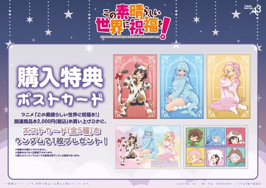 アニメ「この素晴らしい世界に祝福を!」関連商品を2,000円(税込)お買い上げごとに、「ポストカード(全5種)」をランダムで1枚プレゼント。