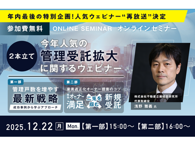 本ウェビナーでは、今年多くの不動産会社様からご好評いただいた「管理戸数を増やす最新戦略(2025年2月開催)」と「家賃適正化オーナー提案のコツ(2025年10月開催)」の2つの人気テーマを、“年末特別企画”として 1日で学べる総集編形式でわかりやすく解説します。