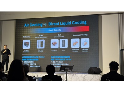 【写真説明】 AIデータセンターが直面する「爆熱」の課題に対し、発表会では従来の空冷(Air Cooling)から液冷(Liquid Cooling)への移行が必然的なトレンドであることが示されました。