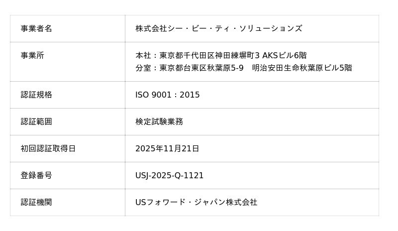CBT・IBT試験等の試験運営業務をメイン事業とする株式会社CBTソリューションズ(本社:東京都千代田区、代表取締役社長:野口功司)は、品質マネジメントシステム(QMS)の国際規格「ISO 9001:2015」の認証を新たに取得しましたので、お知らせいたします。