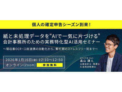 株式会社クリーク・アンド・リバー社の会計分野の子会社であるジャスネットコミュニケーションズ株式会社(JC)は、個人の確定申告シーズンを目前に控えた2026年1月16日(金)に、会計事務所の実務担当者を対象としたオンラインセミナー「紙と未処理データを“AIで一気に片づける” 会計事務所のための実務特化型AI活用セミナー」を開催します。