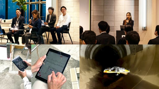 上:当日の様子、左下:藤沢市による現場調査の様子 右下:千葉市によるドローンを用いた下水管点検の様子