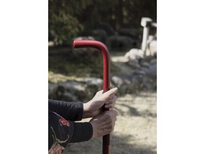 「UP」のアイコン的存在であるペーパーコードが巻かれた持ち手は、デザインのアクセントであるだけでなく、座った状態から立ち上がる際に体重を預けられるグリップとして機能します。また、下部に向けて徐々に径が太くなるように設計されているため、持ち手を握った際に手がずり落ちにくい仕様になっています。家具同様に、当社の木材への知見、木工技術を駆使して丁寧に製造しているため、安心してご使用いただけます。サイズは、様々な体格の方にフィットするよう3サイズを展開。カラーは武内氏が拠点とするイタリアを意識した鮮やかな「Red」となっております。