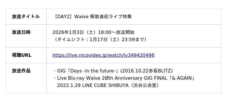 日本武道館公演直前、Waiveの軌跡を辿る2週連続ライブ映像特集をニコニコ生放送にて放送いたします。【12/27(土)18時~、1/3(土)18時~】