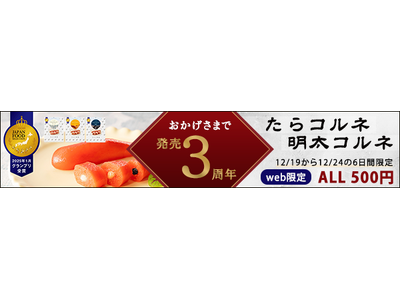 株式会社ヤマトバイオレッツ(本社:福岡県大野城市/ふくやグループ/代表取締役:梁川 剛一、以下 当社)は、「生のたらこに具材を入れる技術」を活用した商品「たらコルネ」が、2025年12月で発売から3周年を迎えたことを記念し、クリスマスに向けた特別価格キャンペーンを実施いたします。