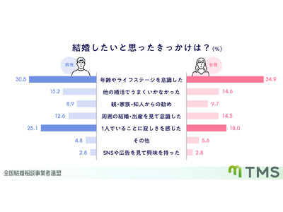 )は、現在結婚相談所で活動中の男女を対象に「結婚したいと思ったきっかけに関する意識調査」を実施しました。その結果、男女ともに「年齢やライフステージを意識した」が最も多い理由であることが分かりました。特に女性はこの理由を挙げた割合が高く、結婚を意識するタイミングにおけるライフプランの重要性がうかがえます。