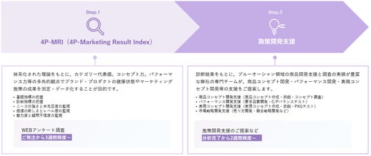 WEBアンケート調査の企画・設計・実査・分析までを一気通貫で対応します。また、商品開発の実績が豊富な専門チームによる診断後の伴走支援も可能です。