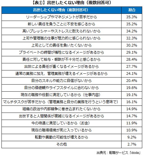 いまの会社で出世したくない理由:最多は「リーダーシップやマネジメントが苦手だから」(35.3%)