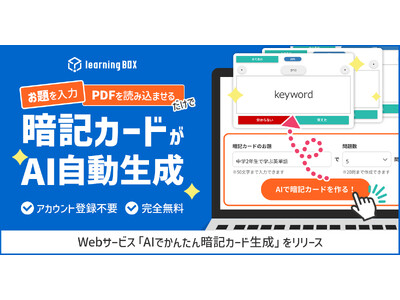 learningBOX株式会社(本社:兵庫県たつの市、代表取締役:西村洋一郎)は、2025年12月22日(月)に、登録不要・無料で使えるWebツール「AIでかんたん暗記カード生成」をリリースしました。本サービスは、お題(キーワード)を入力するだけで、AIが「用語」と「解説」からなる暗記カードを自動生成します。さらに、手元のPDF資料を読み込ませることで、その内容をもとに暗記カードを作成することも可能です。