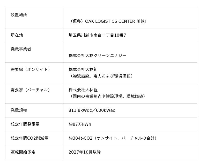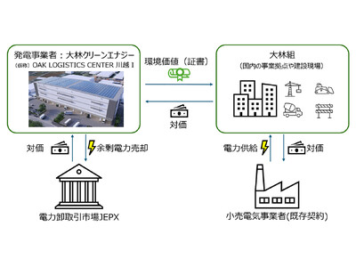 大林組が開発する物流施設「(仮称)OAK LOGISTICS CENTER川越I」(2027年1月末竣工予定)の屋根上に、大林組のグループ会社である株式会社大林クリーンエナジー(本社:東京都港区、社長:菊谷晋吾)が、太陽光発電システムを設置し、電力を供給するものです。同社は、発電した電力を同物流施設に供給するとともに、物流施設が消費しきれない余剰電力を電力卸取引市場で売却し、その環境価値を大林組へ提供します。