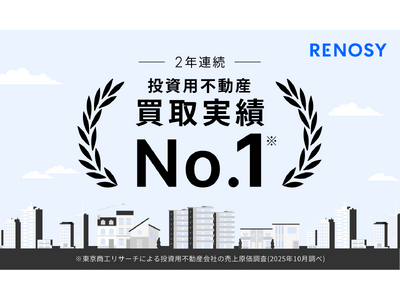 株式会社GA technologies[GAテクノロジーズ](本社:東京都港区、代表取締役 社長執行役員 CEO:樋口 龍、証券コード:3491、以下「当社」)が運営するAI不動産投資「RENOSY(リノシー)」は、株式会社東京商工リサーチによる「投資用不動産会社の売上原価調査(2025年10月調べ)」の結果、投資用不動産の買取実績で2年連続全国No.1を獲得したことをお知らせします。