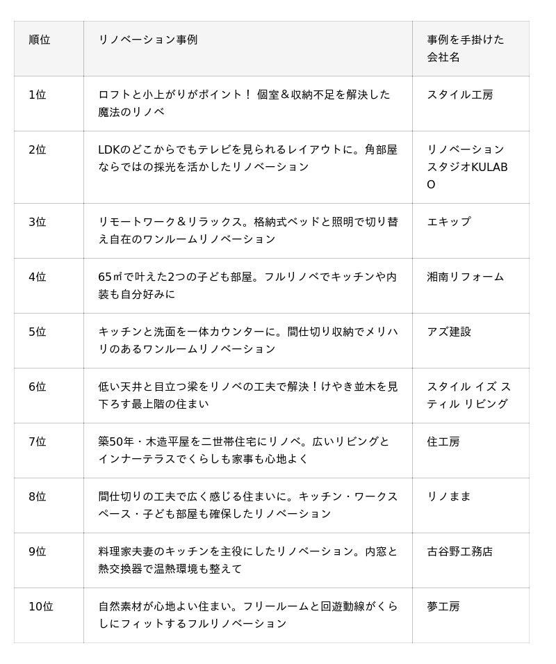 2025年にリノベーション専門の情報サイト《リノベりす》で公開されたリノベーション事例の中から、ユーザーの閲覧数や反響などをもとに、上位10件をランキングしたものです。