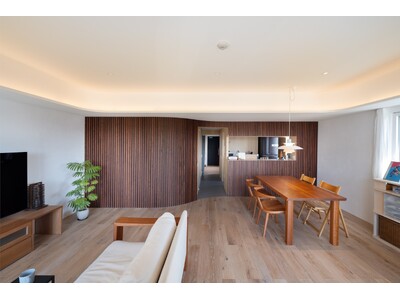 化学物質の影響が無い素材と防音対策を重視し、SUVACOの無料専門家紹介サービス《すばこと》をご利用いただいた施主夫婦。リビングから水回りまでを緩やかにつなぐ壁や、慎重に選ばれた床材・壁材がマンションリノベーションの魅力を高めています。30年後も古びない普遍的でシンプルな空間と、コントラバスをイメージした木のルーバーが印象的な住まいです。