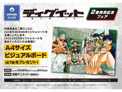 発売を記念して、全国アニメイト・アニメイト通販では12月23日~2026年2月1日まで「『ディグイット』2巻発売記念フェア」を開催。期間中、『ディグイット』の1巻、2巻どちらもご購入いただいた方に、特典「A4サイズビジュアルボード」をプレゼントいたします。