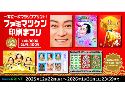 大好評をいただいた「ファミマツケン福袋」に続いて、2025年12月22日(月)からはファミリーマート店内マルチコピー機サービス「ファミマプリント※」で、松平健さんのオリジナルデザインのブロマイドやステッカー全6種類を発売いたします。また、2025年12月26日(金)からは、対象商品を2個同時に買うとおめでたいオリジナルグッズがもらえるキャンペーンを展開するほか、松平健さんとハローキティのコラボレーショングッズを発売します。さらに、「ファミマオンライン」では、アクリルスタンドなど、新春の喜びを彩る松平健さんとのコラボレーショングッズの予約受付を開始いたします。