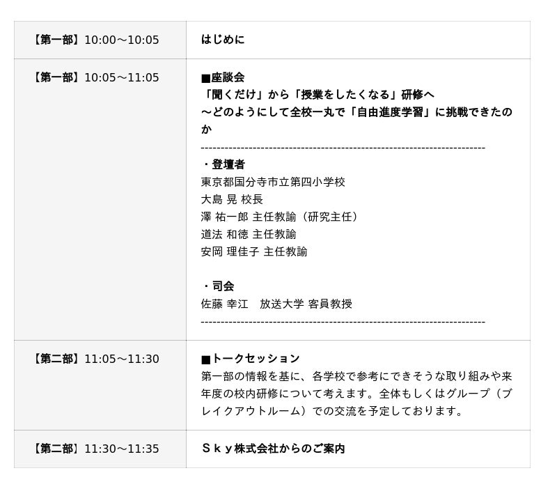 今回は全国の先生方に広く共有するために、どなたでも参加できる公開勉強会とし、2026年1月10日(土)にオンラインで開催いたします。テーマは、教師の主体性を引き出す校内研修です。全校で「自由進度学習」に取り組まれている東京都国分寺市立第四小学校の先生方とともに、授業改善の工夫や、全校で一体となって進めるための校内研修のアイデアを考えます。座談会とトークセッションの二部構成で、第一部のみの聴講も大歓迎です。ぜひご参加ください。