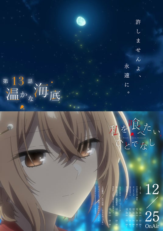 公開された予告映像では、比名子、汐莉、美胡の声とともに、無数の言葉たちが深い海の底から次々と湧き上がり、神秘的な世界観を描き出しています。また、第13話の場面カットを使用したポスターは、それぞれが異なる2枚のカットで構成され、添えられた印象的な言葉が物語への期待を一層高める”エモーショナル”な仕上がりとなっています。