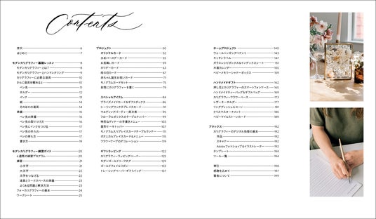 序文/はじめに/モダンカリグラフィー基礎レッスン/モダンカリグラフィー練習ガイド/プロジェクト/アネックス/索引/感謝を込めて/著者について
