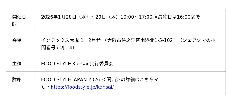 食品の企画開発をサポートするWEBプラットフォーム「シェアシマ」を運営するICS-net株式会社(本社:長野県長野市南石堂町1972、代表取締役:小池祥悟)は、2026年1月28日(水)~29日(木)にインテックス大阪1・2号館で開催される「FOOD STYLE JAPAN 2026<関西>」に合同ブースを出展いたします。ブース番号は2J-14です。会場にお越しの際は、ぜひお立ち寄りください。
