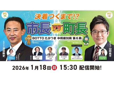 大阪府高槻市は、「BOTTOたかつき 中将棋対局 第6局」を、2026年1月18日(日)15時30分から開催し、ニコニコ生放送で配信します。対局者は濱田剛史高槻市長と山田紘平島本町長、“市長VS町長”による首長同士の直接対局となります。