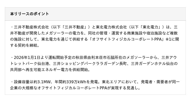 三井不動産株式会社(本社:東京都中央区、代表取締役社長:植田 俊)と東北電力株式会社(本社:宮城県仙台市、代表取締役社長 社長執行役員 石山 一弘)は、メガソーラー由来のオフサイトフィジカルコーポレートPPA※1に関する契約を締結しました。