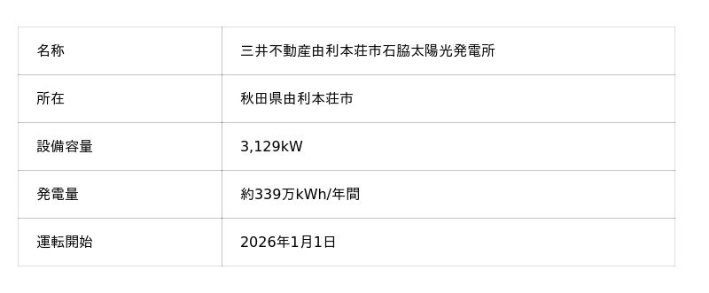 本契約に基づき、2026年1月1日より、三井不動産が開発した秋田県由利本荘市石脇所在のメガソーラーにおける再生可能エネルギー電力(以下「再エネ」)を、東北電力による効率的かつ安定的な需給運用のもと、三井不動産が管理・運営する施設の共用部に供給を開始することをお知らせいたします。