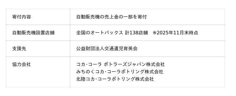 株式会社オートバックスセブン(代表取締役 社長:堀井勇吾)は、連結子会社が運営する全国のオートバックス店舗に、交通事故で保護者を失うなどした子どもたちへの支援団体へ寄付ができるコカ・コーラ社の自動販売機を設置しました。