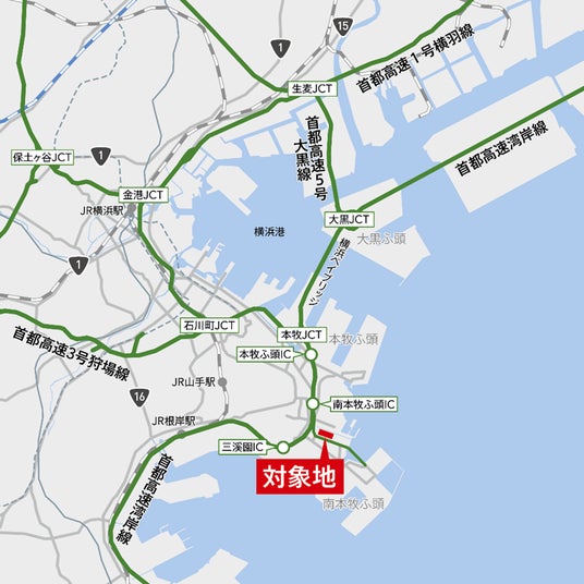 当施設は、横浜市中区に立地し、人口集積地である横浜市中心部へのアクセスが容易です。さらに、首都高速湾岸線「本牧ふ頭IC」から約2.7kmの位置にあることから、東京中心部や羽田空港へのアクセスにも優れています。工業専用地域にある立地のため24時間稼働が実現できるほか、国際貿易港である本牧ふ頭・南本牧ふ頭に隣接していることから、コンテナターミナルとの一体的運用にも適しています。