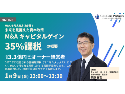 広島を拠点とするM&Aアドバイザリーを提供しているクレジオ・パートナーズ株式会社(本社:広島県広島市 代表取締役:李 志翔)は、【2026年度税制改正】超富裕層に対する課税(ミニマムタックス)強化に関する税制改正解説ウェブセミナーを2026年1月9日(金)に開催します。