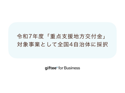 「giftee for Business」では、受給者の多様なニーズに対応でき利便性が高い全国でご利用いただける各種デジタルギフトの提供に加え、自治体毎の運用にあわせたギフト配布のためのソリューション、効果測定、事務局等の設置・運営までを一気通貫でご提供しています。受給者の満足度向上に寄与する給付内容や方法の提供が可能なソリューションとして、また、自治体担当者の業務負荷の軽減ならびに効率的な運用に資するソリューションとして、これまで、出産・子育て支援をはじめとした全国の自治体の生活者支援事業において、多数の導入をいただいております。「重点支援地方交付金」を活用し令和7年度に実施する対象事業についても、秋田県、山形県、千葉県船橋市、東京都東大和市、長野県上伊那郡辰野町、兵庫県西宮市、兵庫県高砂市の全国7自治体において、「giftee for Business」を採択いただきました。これらの実績を評価いただき、この度、茨城県つくばみらい市、埼玉県川越市、大阪府藤井寺市、兵庫県加古郡稲美町の4自治体が令和7年度に実施する「重点支援地方交付金」の対象事業に、「giftee for Business」を採択いただく運びとなりました。