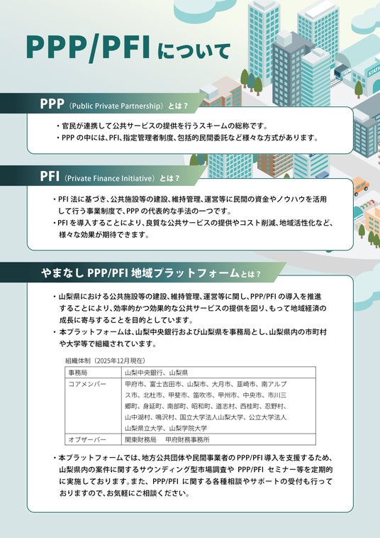 株式会社山梨中央銀行(頭取 古屋 賀章)および山梨県(知事 長崎 幸太郎)が事務局を務める「やまなしPPP/PFI地域プラットフォーム」(以下「地域PF」といいます)では、サウンディング型市場調査等を通じて公共施設の整備・運営等に関する案件の検討を支援するなど、官民連携に向けた取組みを推進しています。