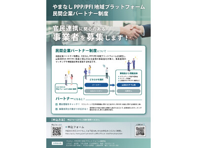 今般、幅広い事業者でのネットワークによる山梨県内におけるPPP/PFIの活用の推進と事業者同士の連携強化を図るため、新規に参画を希望する事業者を募集します。
