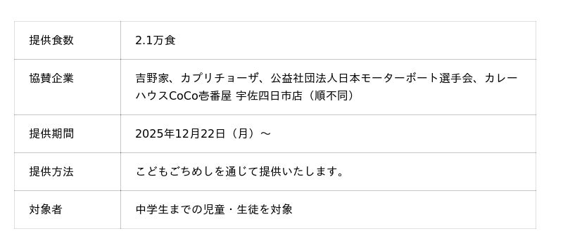 クリスマスや年末年始などイベントが重なり、普段より出費が増える傾向があるため、家計の圧迫度が一段と高まる時期です。こうした状況から、KFPは「季節ごとに変動する食の不安に継続して寄り添う支援体制」の必要性を再認識し、冬休み中の「子どもの食の不安」を解消するため、企業・飲食店と連携した支援規模の拡大を決定しました。