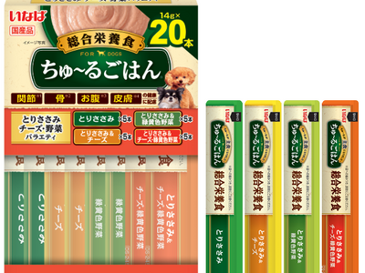 いなばペットフード株式会社(いなば食品グループ 本社:静岡県静岡市清水区由比)は、わんちゃん用「ちゅ~るごはん」20本入りBOX「とりささみ チーズ・野菜バラエティ」を新発売いたしました。「愛犬には、健康に配慮しながら、おいしいごはんを飽きずに食べてほしい」というのは、多くの飼い主様の願いです。その想いに応えるため、1つのパックで4つの味と、関節・骨・お腹・皮膚という4つの健康維持をまとめてサポートできる、新しいバラエティパックを開発いたしました。