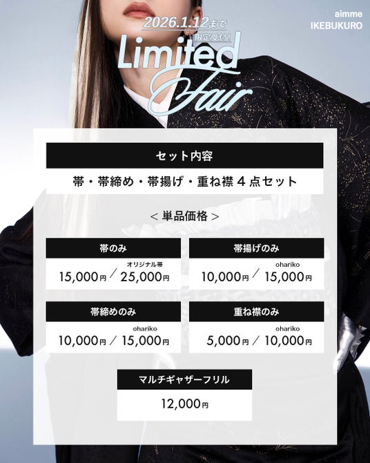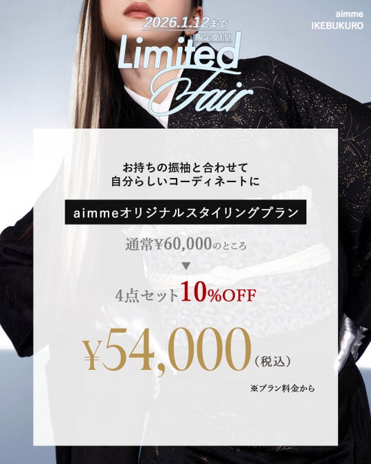 成人式を目前に控え、「帯や小物がまだ決まっていない」「振袖は用意したものの、コーディネートに悩んでいる」といった声に応え、aimme東京池袋店では**「帯・小物レンタル かけこみフェア」**を開催いたします。