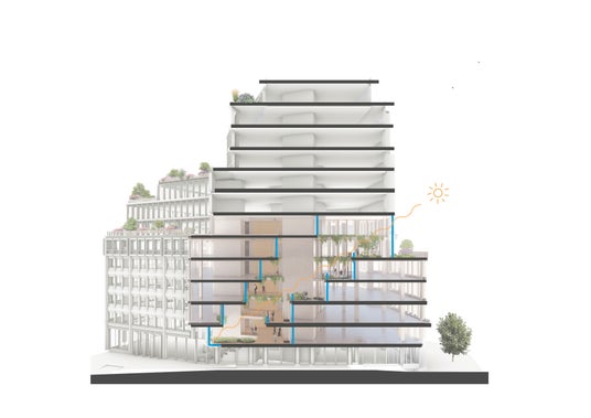 周辺は景観の保全が強く求められる保存地区で、カムデン区と協働し歴史的景観と調和するデザインを採用しています。地上階には、かつて繋がっていた Old Compton Street と New Compton Street を結ぶ通路を新設し、沿道にオフィスエントランス、商業区画、起業家支援のアフォーダブルオフィスを配置することで地域活性化に寄与します。