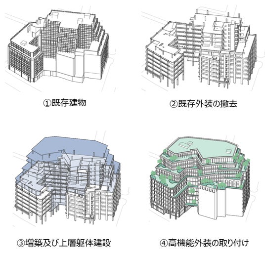 ・ 躯体の約75%を再利用、二層の増築、既存アトリウム部分の増築などフロアプレートを合理化