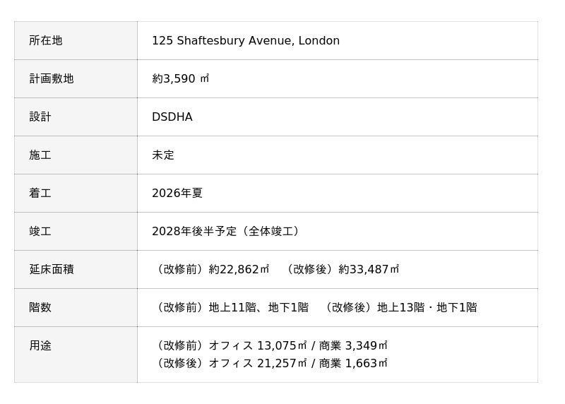 三菱地所株式会社、東京建物株式会社、東光電気工事株式会社、芙蓉総合リース株式会社、EDGE Real Estate B.V.(EDGE社)は、レンダーの三井住友信託銀行株式会社と共に、英国・ロンドンにおけるオフィス大規模改修事業「125 Shaftesbury(シャフツべリー) Avenue」を本格始動いたします。本計画は2023年に三菱地所ロンドン社とEDGE社が取得したオフィスビル(1982年竣工)の大規模改修事業で、両社がこれまで国内外で培ってきた開発事業の知見を活用しながら、共同で基本計画・設計を推進し、行政協議や開発許認可プロセスを進めてきました。総事業費は約550百万ポンド(約1,045億円、1ポンド=190円換算)、2026年夏に着工し、2028年竣工を予定しております。今般、東京建物株式会社、東光電気工事株式会社、芙蓉総合リース株式会社の3社が新たに参画し、今後は5社にて共同で推進してまいります。