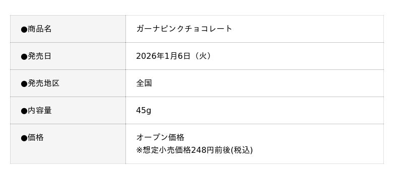株式会社ロッテ(東京都新宿区、代表取締役社長執行役員:中島英樹、以下ロッテ)は、とろけるくちどけのチョコレート「ガーナ」ブランドから、「ガーナピンクチョコレート」を1月6日(火)より発売します。「ガーナピンクチョコレート」は、ガーナホワイトにいちごパウダーを練りこみ、ミルク感と甘酸っぱい苺の味わいが楽しめます。さらにパッケージは苺をあしらったピンク色が映えるデザインで、苺の季節をかわいらしく演出します。