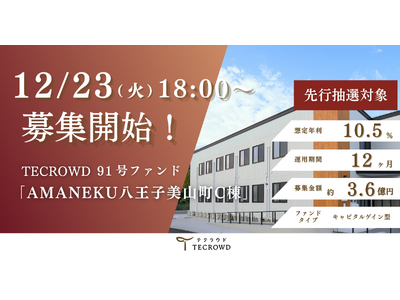 1口10万円から投資ができる不動産クラウドファンディング「TECROWD」の91号ファンド(募集金額約3.6億円)を12月23日(火)18時より募集を開始いたします。