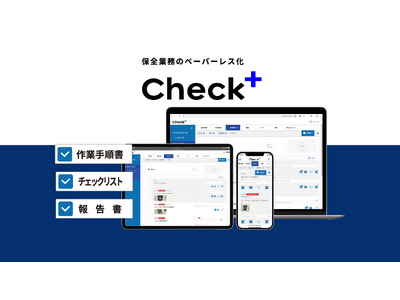 『Check+』は作業手順作成から進捗管理、報告までの業務をデジタル化するクラウドサービスです。作業手順とチェックリストを一体化した作業計画の作成、タブレットやスマートフォンを使った点検の実施記録、作業実績の確認や電子承認・報告書の自動出力などが可能です。
