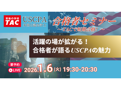 TAC株式会社(東京都千代田区、代表取締役社長:多田 敏男)は、TACで受講され、USCPA試験に短期合格を果たした合格者が合格の秘訣などをオンラインセミナーで2026/1/6(火)に語ります。