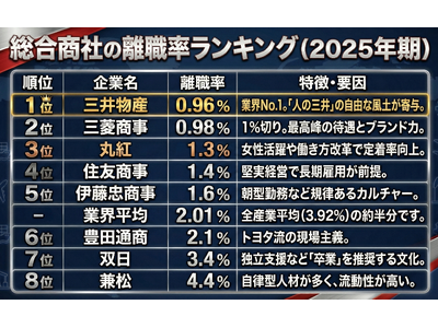 本調査では、離職率ランキングとともに、各社の開示情報から読み取れる定着要因(制度・カルチャー)を整理し、商社業界の「定着力」を可視化しました。