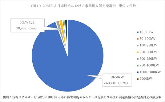 経済産業省の統計によると、(図1)[4]のように2025年3月末までに導入された事業用太陽光発電設備の件数は全国約70万件にのぼり、そのうち出力10kW以上50kW未満の低圧発電所は約66万件で、全体の95%を占めています。非常に大きなポテンシャルを秘めた市場にもかかわらず、低圧太陽光発電所はFIP制度下の移行に伴う手続きや業務負担は規模に関わらず同じであるため、事業環境は採算性の高い高圧案件に偏っているのが実情です。