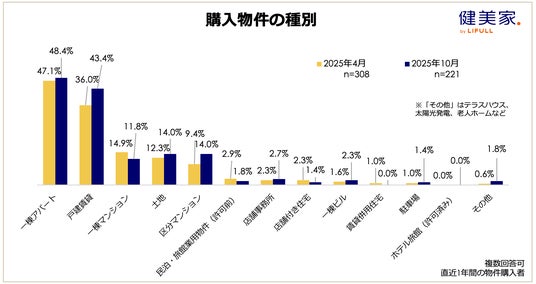 『不動産投資に関する意識調査(第24回)』(2025年10月、以下『意識調査』)によると、2024年10月以降に投資家が実際に購入した物件種別では、「戸建賃貸」が43.4%に達し、2025年4月時点の36.0%から7.4ポイント急増しました。これは「一棟アパート(48.4%)」に迫る水準であり、戸建投資が主力の一角を占めるようになったことを示しています。[図1]