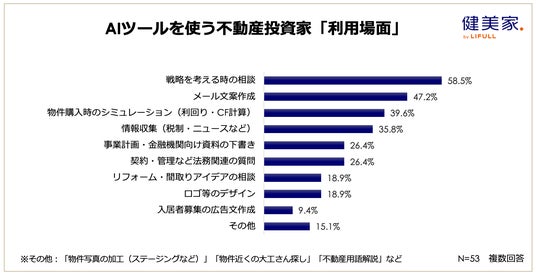 健美家が実施した『AIツールの利用に関する不動産投資家アンケート』(2025年8月)によると、不動産投資家の42.0%がすでにAIツールを利用しており[図10]、その利用目的の第1位は「戦略を考える時の相談(58.5%)」でした。これは「メール・文章作成(47.2%)」や「物件のシミュレーション(39.6%)」を上回る数字です。「客付けのアイデア出し」や「リフォームプランの相談」、「融資戦略の壁打ち相手」としてAIを活用する動きが広がっており、投資家がAIに対し、客観的な意見や多角的な視点を提供してくれるパートナーとしての価値を見出していることがわかります。[図11]