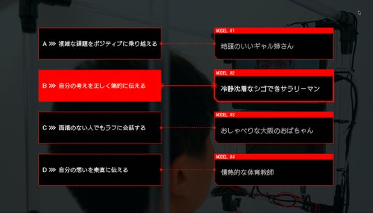 コミュニケーションにおいて改善・強化したいポイントを選ぶ体験者が選んだ強化ポイントに応じて、最適なAIモデルが選択される