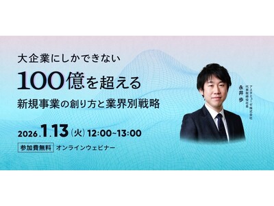 アスタミューゼ株式会社(本社:東京都千代田区、代表取締役社長 永井歩)は、2026年1月13日(火)12:00-13:00に、無料ウェビナー「大企業にしかできない100億を超える新規事業の創り方と業界別戦略」を開催いたします。失敗・課題を解決する方法や取り組み事例について具体的にご紹介致します。