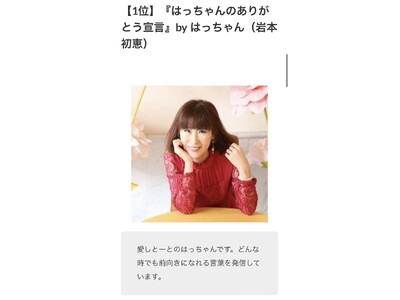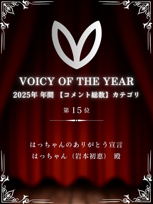 「株式会社愛しとーと」(福岡県那珂川市)代表のはっちゃんこと岩本初恵のVoicyチャンネル「はっちゃんのありがとう宣言」が2025年間ランキング「差し入れ数」部門で2年連続となる1位を獲得しました。